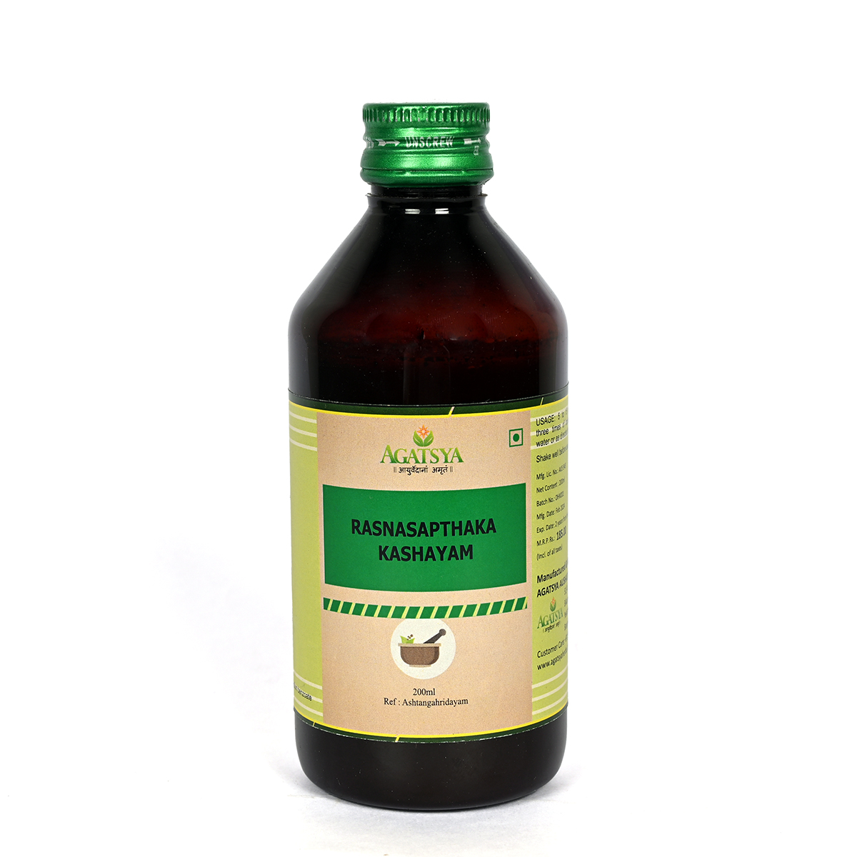 Agatsya Rasnasapthaka Kashaya is an Ayurveda medicine in the form of decoction. This Kashaya is formulated with Rasna, Guduchi, Aragvadha, Devadaru, Gokshura, Eranda and Punarnava. It helps to pacify the vitiated Vata and Kapha dosha.This excellent combination imparts strength along with alleviating inflammation. It promotes joint health by maintaining its stability and mobility. This combination is prescribed in Rheumatoid arthritis,Lumbar spondylosis,Pain in back, thigh, hip region.