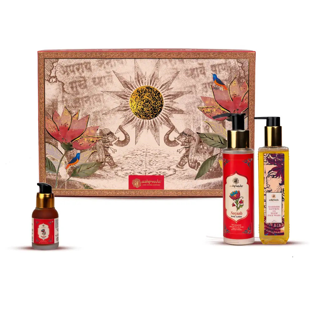 The Saffron Delight kit features the luxurious Nayaab Serum, Nayaab Brightening Lotion, and a refreshing Face Wash. This trio harnesses the radiance-boosting power of saffron to illuminate your skin, leaving it smooth, hydrated, and glowing with a natural, healthy complexion.