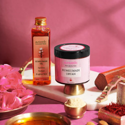 Adding a few drops of your favourite Kumkumadi Tailam to this rich Ubtan will ensure more even skin toned with added extra glow.