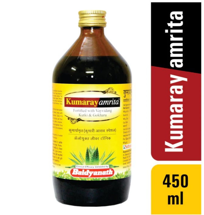 Kumaryamrita is a natural remedy for treating Digestive and Liver disorders with goodness of potent herbs – Aloe Vera. Aloe Vera relieves the problems related to digestive system. Kumaryamrita is a KumariAsav Special formulation containing additional valuable herbs like Sharpunkha (Tephrosiapurpurea) which treats liver disorders, Giloy (Tinosporacordifolia) boost immunity while Patolpatra (TrichosanthesDioica) improves digestion. Prepared by the traditional methods of fermentation of asav so it get absorbed more easily.