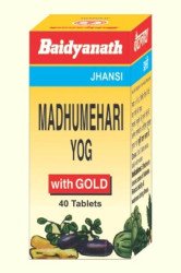 Madhumehari Yog With Gold (Swarna Yukt) by ‘Shree Baidyanath Ayurved Bhavan’ is a herbo-mineral metallic medicine prepared from Trivang Bhasma, Gold Bhasma and medicinal herbs. It is indicated in Madhumeha or diabetes (in both Diabetes Mellitus and Diabetes Insipidus). It controls the blood sugar level and gives relief in excessive thirst and urination, tingling sensation, fatigue etc. It gives strength and cures debility.