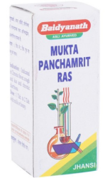 Mukta Panchamrit Ras (Moti Yukta)a is minerals containing Ayurvedic medicine. This medicine has five ingredients viz. Moti pishti, Moonga bhasma, Bang bhasma, Shankha bhasma and Muktashukti bhasma. This medicine is indicated in treatment of pulmonary tuberculosis or a similar progressive wasting disease, in initial stages. It is a useful medicine for treating chronic fever, chronic diarrhoea, piles etc. It cures jwara vyadhi, jeerna jwara, in severe condition of rajayakshma. By using rogoktha anupana it is said to cure almost all type of diseases. It balances vata and kapha.