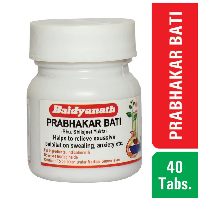 Prabhakar Bati is an herbomineral classical Ayurvedic Medicine available in tablet form used to manage cardiac function naturally with clinically proven herb Arjuna. Arjuna is well known to lower cholesterol levels in the body, allays the symptoms of palpitation, excessive sweating, restlessness, etc. It pacifies Vata and Pitta doshas.