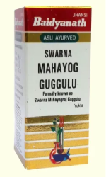 Baidyanath Swarna Mahajograj Guggulu contains herbal and mineral ingredients in a tablet form.