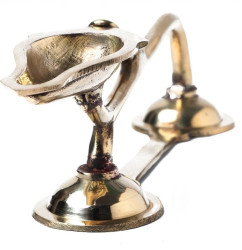 Presenting the Brass Camphor aarti diya with handle, a sacred and ornate creation designed for Hindu temples and pooja rooms. Crafted from durable brass metal, this exquisite piece holds profound significance in the practice of worship. As a customary ritual, camphor is delicately ignited within the Aarti plate during poojas, emanating a luminous flame that symbolizes devotion and reverence.