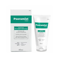 Psoramist Moisturizing Cream is a targeted solution to address the multifaceted challenges of Psoriasis. It is tested by dermatologists and designed specifically for psoriasis-prone skin. With the exfoliating property of a mild 1% Salicylic Acid and natural enzyme Papain, Psoramist Cream gently eliminates scaly, itchy flakes, revealing a clearer complexion. It effectively relieves dryness and itching, making it a trustworthy aid in managing psoriasis symptoms. Enriched with potent ingredients like Cocoa Butter, Shea Butter, Allantoin, and Glycerin, it deeply moisturizes and shields the skin, ensuring a soft and supple texture
