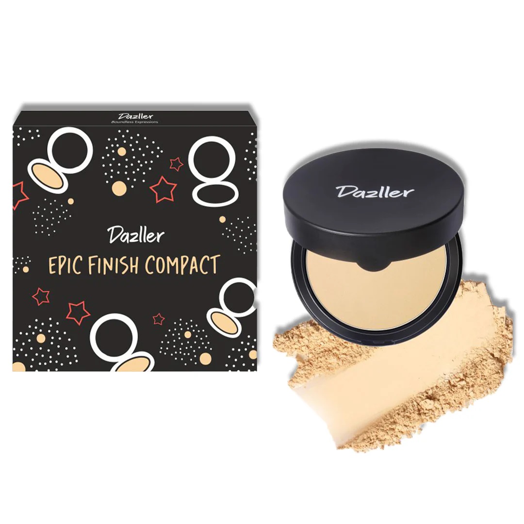 Dazller Epic Finish Compact Powder, your must-have to a flawless, natural matte finish that complements all Indian skin tones. With an impressive range of 16 shades, this compact powder is designed to suit every complexion, ensuring that you find your perfect match. This lightweight powder offers a satin soft texture, that is comfortable with a weightless feel on your skin. It also offers buildable coverage, allowing you to tailor your look from subtle to refined as desired. Dazller Epic Finish Compact Powder boasts effective oil-control properties, helping you maintain a fresh, matte look throughout the day suitable for all skin types. Each compact comes with a soft powder puff for easy application and it blends like a Pro. The compact is enriched with Vitamin E for added skin nourishment and protection. Choose Dazller Epic Finish Compact Powder to gloat over a beautiful matte finish that enhances your natural beauty. Discover your perfect shade and enjoy a pristine complexion that exudes confidence and elegance.