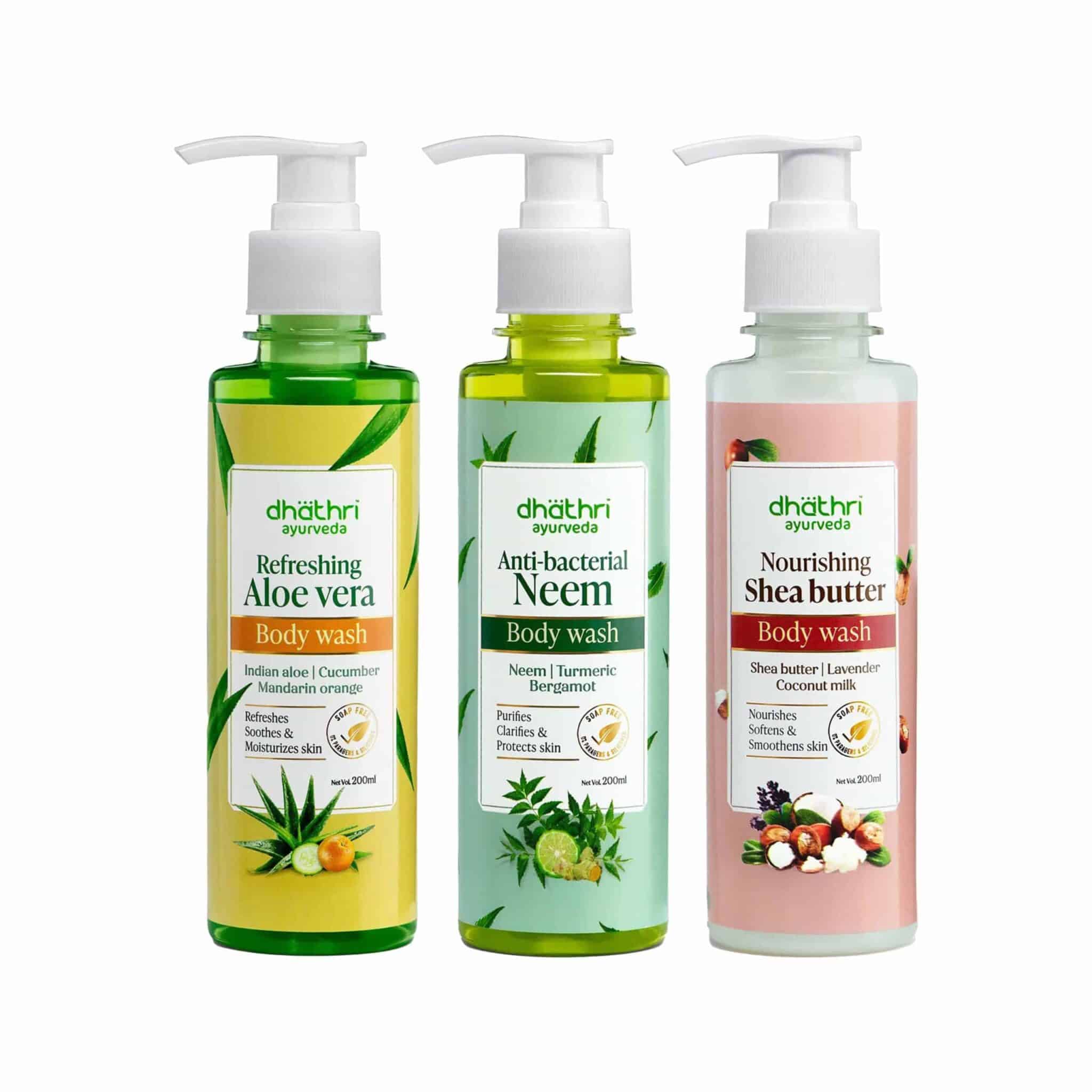 This is a body wash bundle from the house of Dhathri that includes Nourishing Shea Butter Body Wash, Refreshing Aloe Vera Body Wash, and Anti-bacterial Neem Body Wash giving you an experience of nourishing showers with every use.
