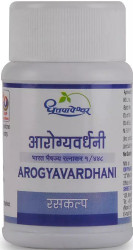 Arogyavardhani as the name indicates destroys all diseases & promotes Health. It is the drug of choice in all skin diseases. Excellent in Pandu as well as enlargement of Liver & Spleen due to ingredients like Loha Bhasma, Tamra Bhasma & Kutaki. It also acts as Deepak, Pachak, Malashodhak, Hrudya & controls Mansa & Medavruddhi.