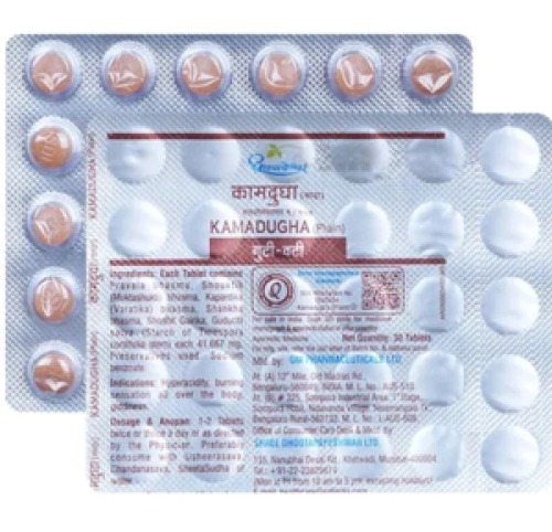 Dhootapapeshwar Kamdudha Plain Vati contains 1 part of each Pravala Bhasma, Shouktik Bhasma, Kapardika Bhasma, Shankha Bhasma, Shuddha Suvarnagairik, and Guduchi Satva as active ingredients.