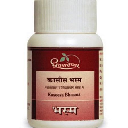 Dhootapapeshwar Kaseesa Bhasma : Due to its Kashayatva, Kaseesa Bhasma has a broad range of utility from Netra Vikar, till Dhatuposhan. It is an uttam Agnideepak and Amapachak bhasma. Kaseesa Bhasma has proved to be an excellent Rasa- Raktaposhak and hence beneficial in Panduroga. Due to its Shamak action on vitiated Pittadosha,