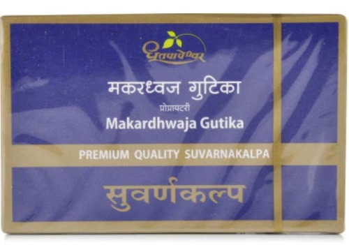 Dhootapapeshwar Makardhwaj Gutika Standard Quality Suvarnakalpa Tablet is usually used to treat sperm-related problems. It may improve sperm motility and quality and may increase the virility and vigour of the individual.