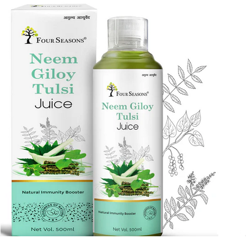 Four Seasons Neem Giloy Tulsi Juice contains the goodness of three herbs that have beneficial effects on immunity and skin. Giloy possesses rasayana properties and is an adaptogen that helps reduce stress and fatigue. Neem has antimicrobial properties, which is good for the skin to reduce acne. Neem also helps improve liver function and aids in detoxification. Tulsi is good for respiratory health and helps alleviate cough and cold. Tulsi also helps boost immunity and has antioxidant properties.
