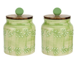 Green Shaded Embossed Ceramic Air Tight Jars with Wooden Lids - Set of 2 :