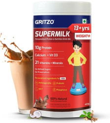 Gritzo SuperMilk provides personalized nutrition according to age, gender & goals with the goodness of natural ingredients & 3 sources of protein. Specialized for 13+ years old teens for their weight gain.