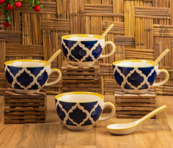 Hand Painted Ceramic Soup Bowl With Spoon and Handles (Set of 4, Yellow) :