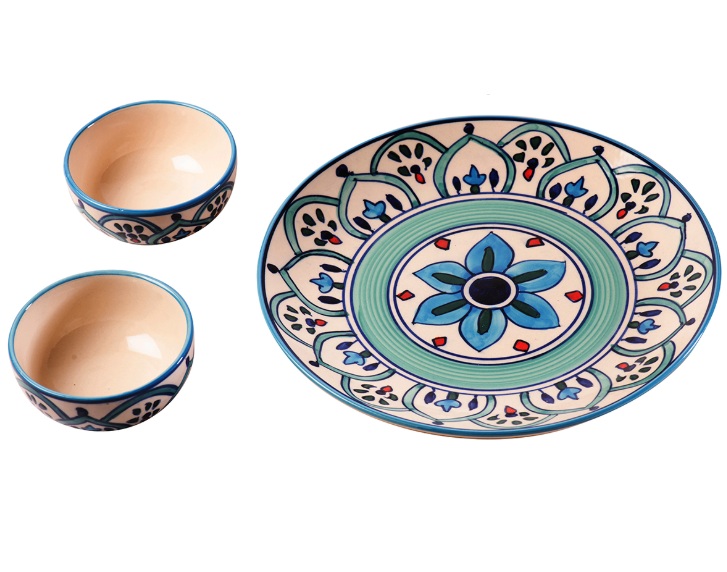 Handpainted Ceramic Dinner Plate with Two Bowls (Green) :