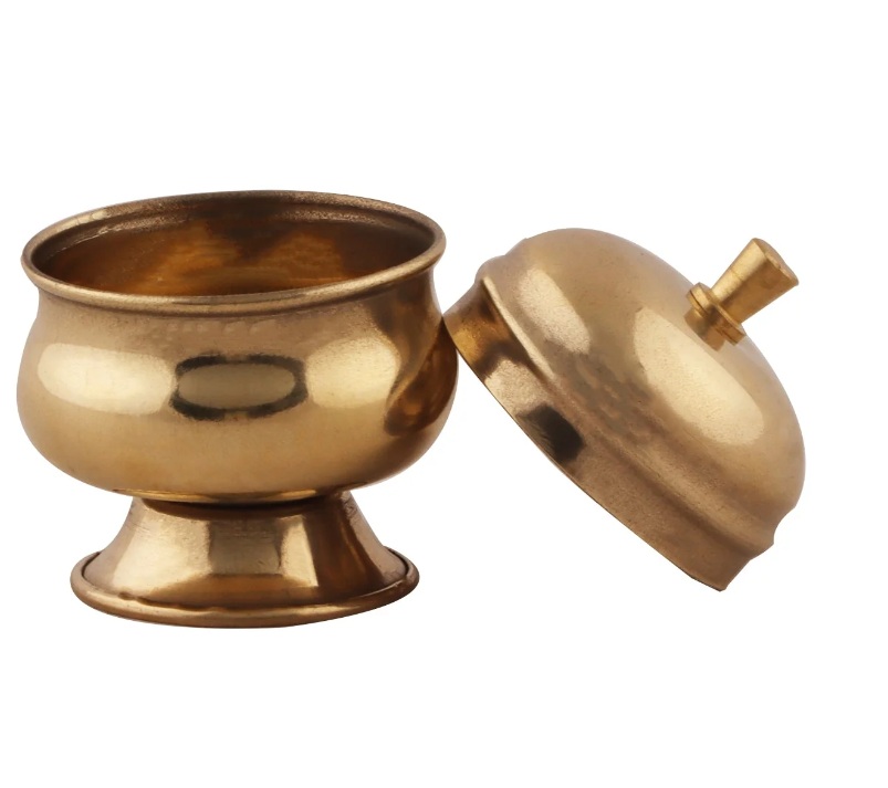 This brass kumkum box features a compact and portable design. It has a rounded body with a lid that securely fastens to keep the contents safe and prevent spillage.