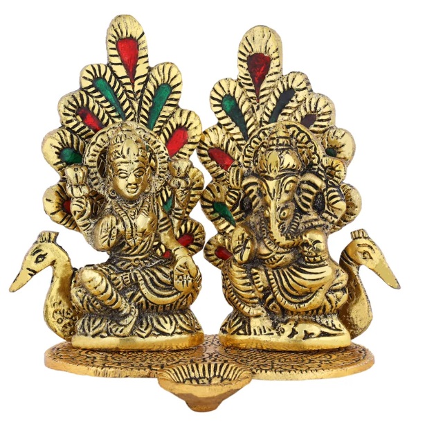 Lakshmi Ganesh Murti Sitting On Peacock Base With Deep - 5 x 5.5 Inches | Metal & Gold Polish Lamp for Home