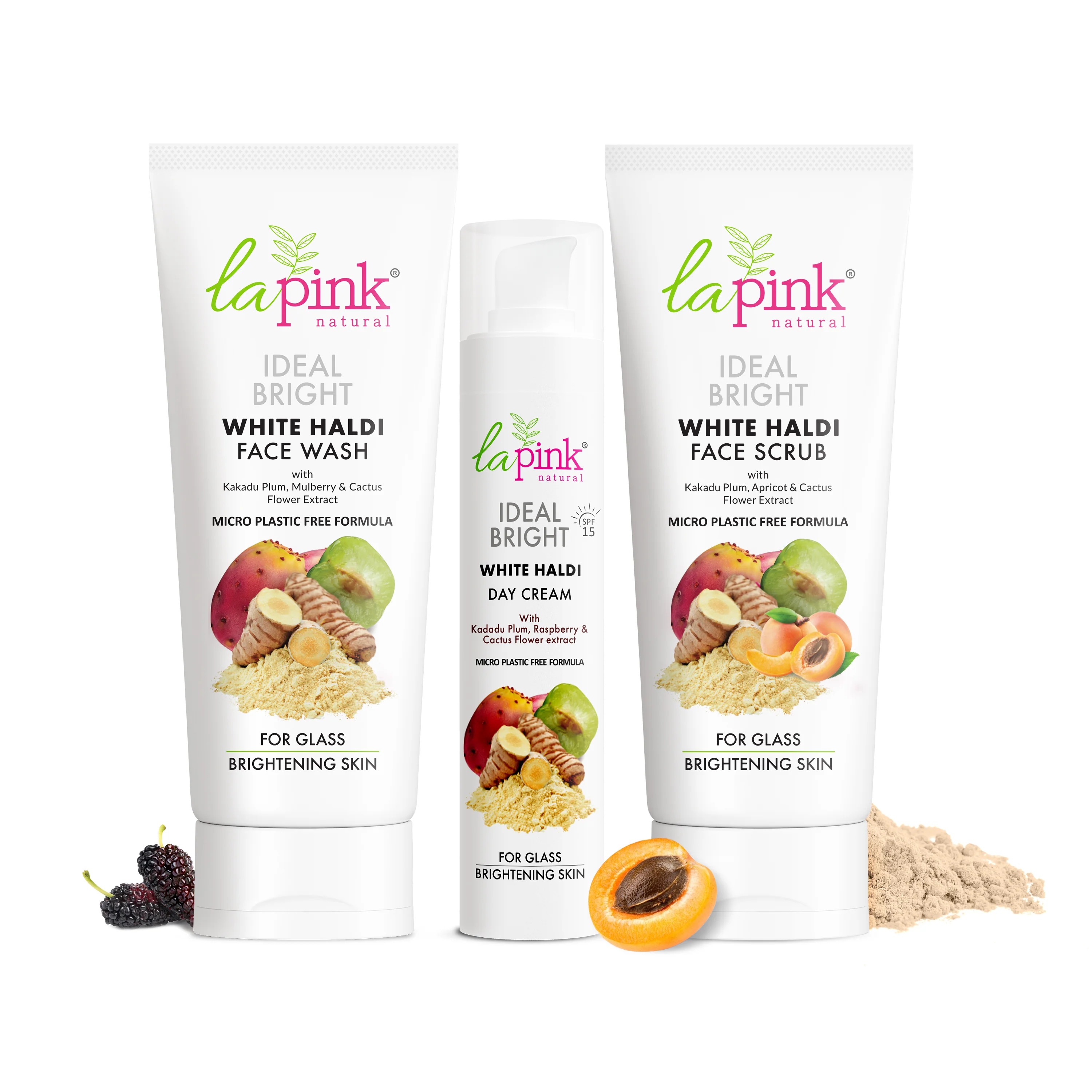 Experience the transformative power of the La Pink Ideal Bright Complete Cleansing Combo, designed to give you a brighter, lighter, and flawless complexion. Begin your routine with the Haldi Face Wash, a 100% microplastic-free formulation enriched with Kakadu plum, Mulberry, and Cactus flower extract, renowned for their skin-lightening and brightening properties.
