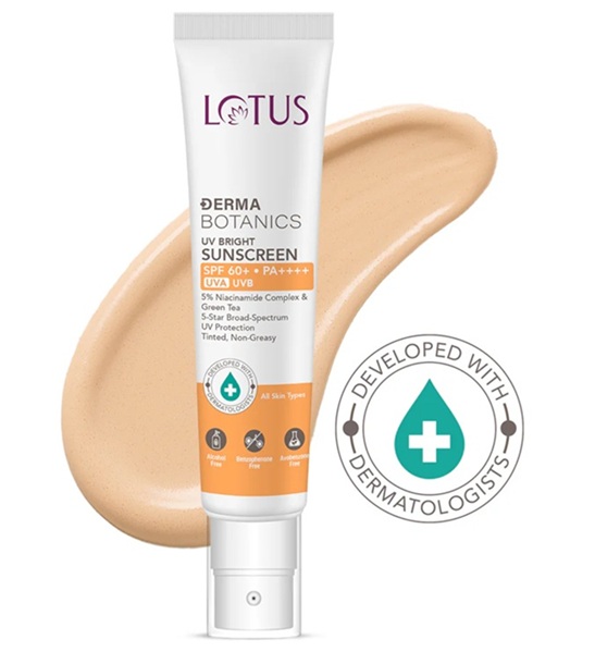 Lotus Derma Botanics UV Bright Sunscreen SPF 60 + : a perfect formulation of derma protection and botanical skincare. With Niacinamide complex and Green Tea, this dermatologically tested, non-greasy, and tinted sunscreen provides 5-star protection against UVA and UVB rays, suitable for all skin types