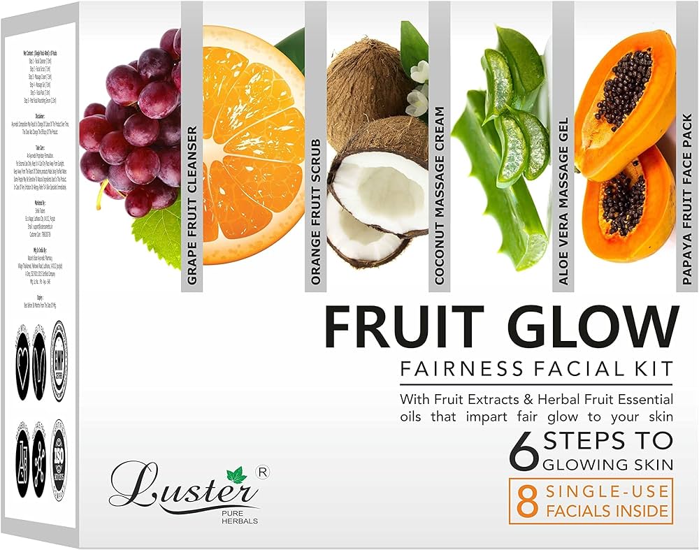 Luster fruit glow fairness facial kit ( Single Use Facials) with fruit extracts & herbal fruit essential oils that impart fair glow to your skin. Improves skin's hydration and metabolism, prevents premature aging, removes pigmentation, age spots, lines and wrinkles, boosts collagen regeneration, and strengthens elastin fibres to reveal radiant, luminous, youthful complexion. Its helps treat blemishes & pigmentation. Keeps skin fresh and over glowing. It Enriched with the goodness of Grape, Licorice, Orange & jojoba Seed Oil Extracts. It Helps Fairness & Glowness and also giving Soft & smooth Skin. It helps give your skin Clears Tanned Skin Appearances. It suits all types of Face skin.