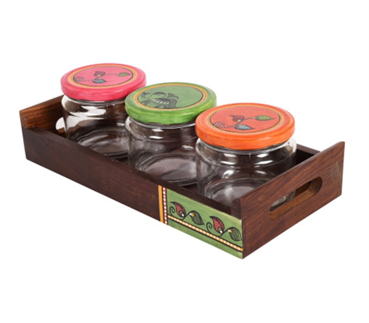 Madhubani Art Handcrafted Wooden Tray with Glass Jars :