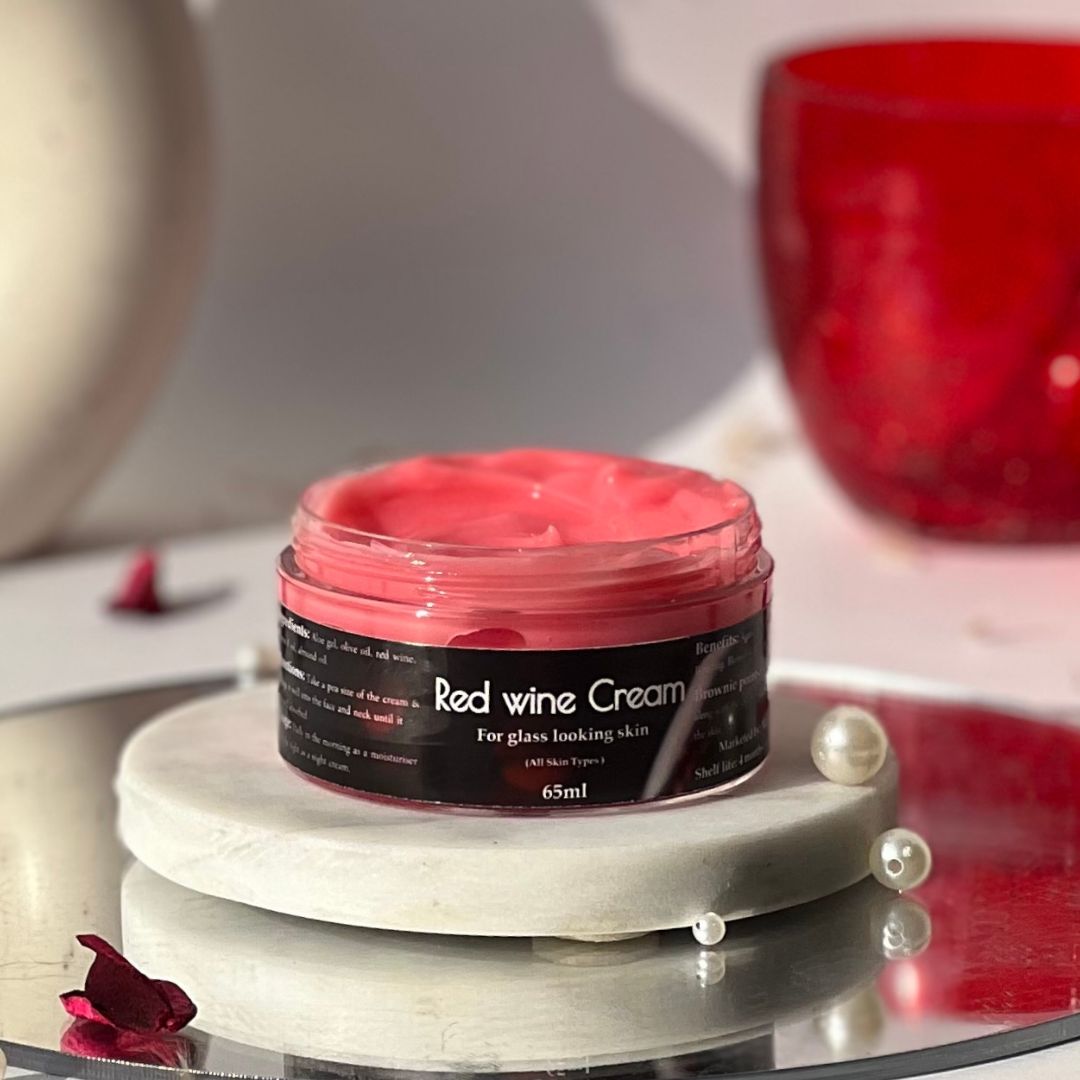 Magical Jar Red wine cream :Ingredients: Aloe gel, olive oil, red wine, vitamin E oil, almond oil.Benefits: Reduces Ageing Say Bye to Fine Lines Induces Collagen Keeps Skin Hydrated Removes the Blemishes on the Skin