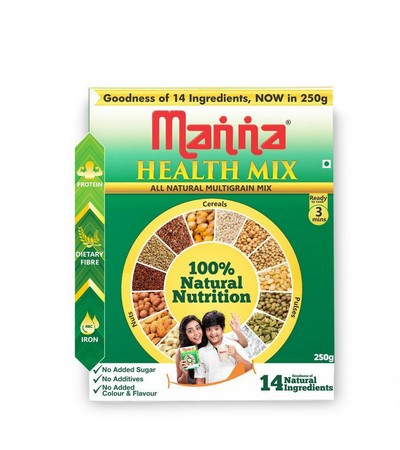 Manna Health Mix - Grab Manna Health Mix, that offers you all the elements, essential for fulfilling all the nutritional requirements. Ensure that you get a better health nutrition. Manna Health Mix has got all the blend of mixed cereals and nuts, including Ragi, Maize, Jowar, Wheat, Barley, Soya Bean, Green Gram, Millet, Fried Gram, Cardamom, Sago, Groundnut, Cashews and Almonds. The Pack contains a solid mix of all the above mentioned ingredients in the form of a ready to eat meal. Choose the best when it comes to the matter of proper health.