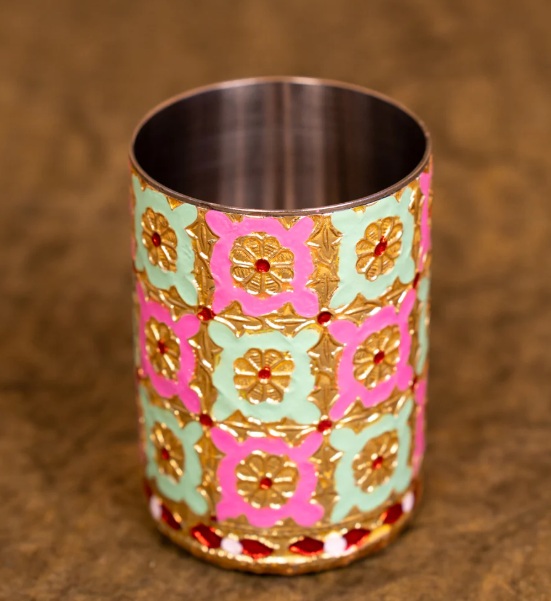 This Meenakari Glass in Pink & Teal Green is a beautiful, handcrafted piece perfect for dining or gifting.