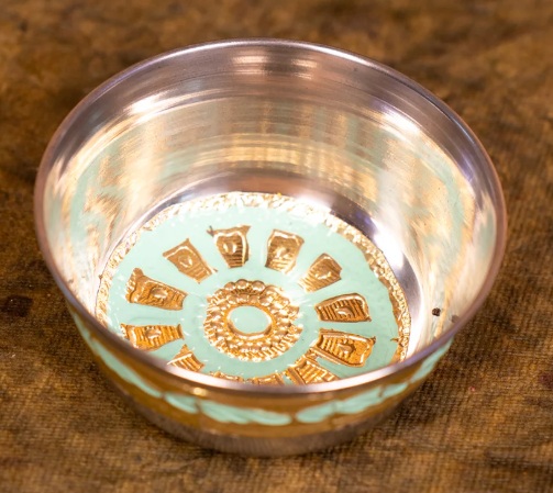 This hand-crafted Meenakari Katori features elegant green decoration, perfect for both pooja and dining purposes.