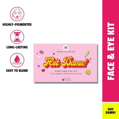 Hot Damn is an all-in-one Face & Eye Makeup Kit that has all your PM makeup essentials - blush, highlighter, luminous setting powder and eyeshadow. This glamorous eye and face makeup kit is truly the fastest way to ace a fierce nighttime makeup look. It contains a muted crimson eyeshadow in shimmer, a deep nude eyeshadow in matte, a peach blush with red undertones, a warm toned highlighter, and a luminous translucent setting powder. Ideal for days when you want to #WerkIt, swipe on some shimmer and get ready to partay!