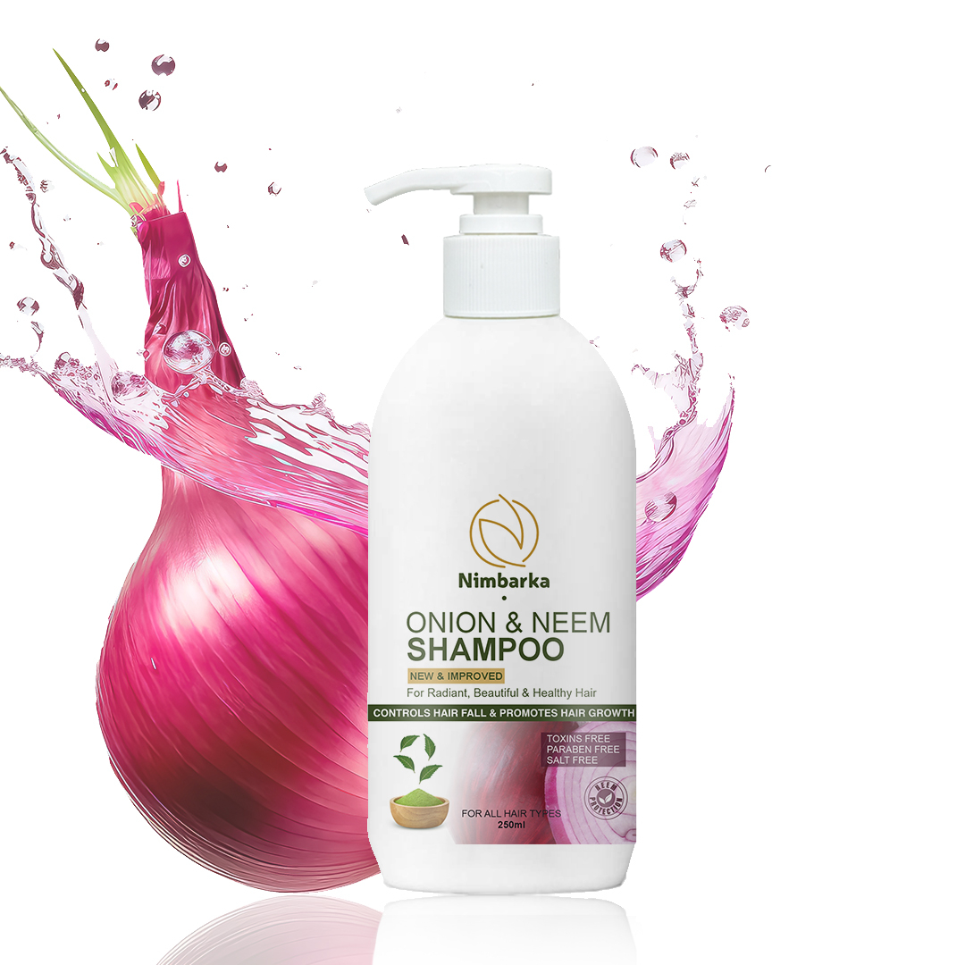 Pollution & unhealthy lifestyle take a toll on hair gowth & overall health of hair. Nimbarka's Onion & Neem Shampoo is a boon for those struggling with hair fall, inhibited hair growth and weak roots. Neem helps fighting stubborn dandruff and improves scalp health making hair roots strong. Onion seed extrat helps revive weak hair follicles and promotes hair growth by clarifying the blocked roots. This shampoo not only improves hair texture, it keeps hair smooth, shiny & frizz-free.