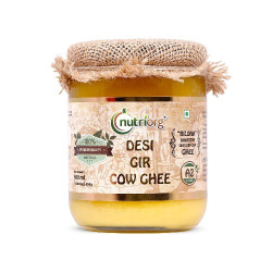Nutriorg Pure Desi Gir Cow Ghee is made from desi cow milk that comes directly from our own grass-fed cows. Their calves are given first milking preferences, and the milk gathered afterward is boiled to make curds—which then go into making your favorite gourmet foods! The whole curd is churned using a wooden churner, resulting in butter, then heated slowly to create Vedic ghee. To make traditional ghee, butter is separated from the milk solids once all of the water has evaporated. The Nutriorg Desi Gir Cow Ghee is hugely beneficial for the entire body. Consumption of ghee offers a wide range of benefits, including clarity of mind and improves immunity. Because of its high smoke point (250C or 482F), ghee is one of the best to use in cooking since it doesn’t break down into free radicals like others It aids weight loss as the type of saturated fat that Desi Gir Cow Ghee has is a short-chain fatty acid.