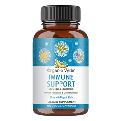 Organic Veda Immune Support Veggie Capsule is a powerful blend of potent immune boosting ingredients including neem leaf, turmeric root, tulsi leaf and black pepper fruit to bolster your immune system, recover and improve overall health. The high-potency nutrients and antioxidants help boost immunity and protect from free radical damage.