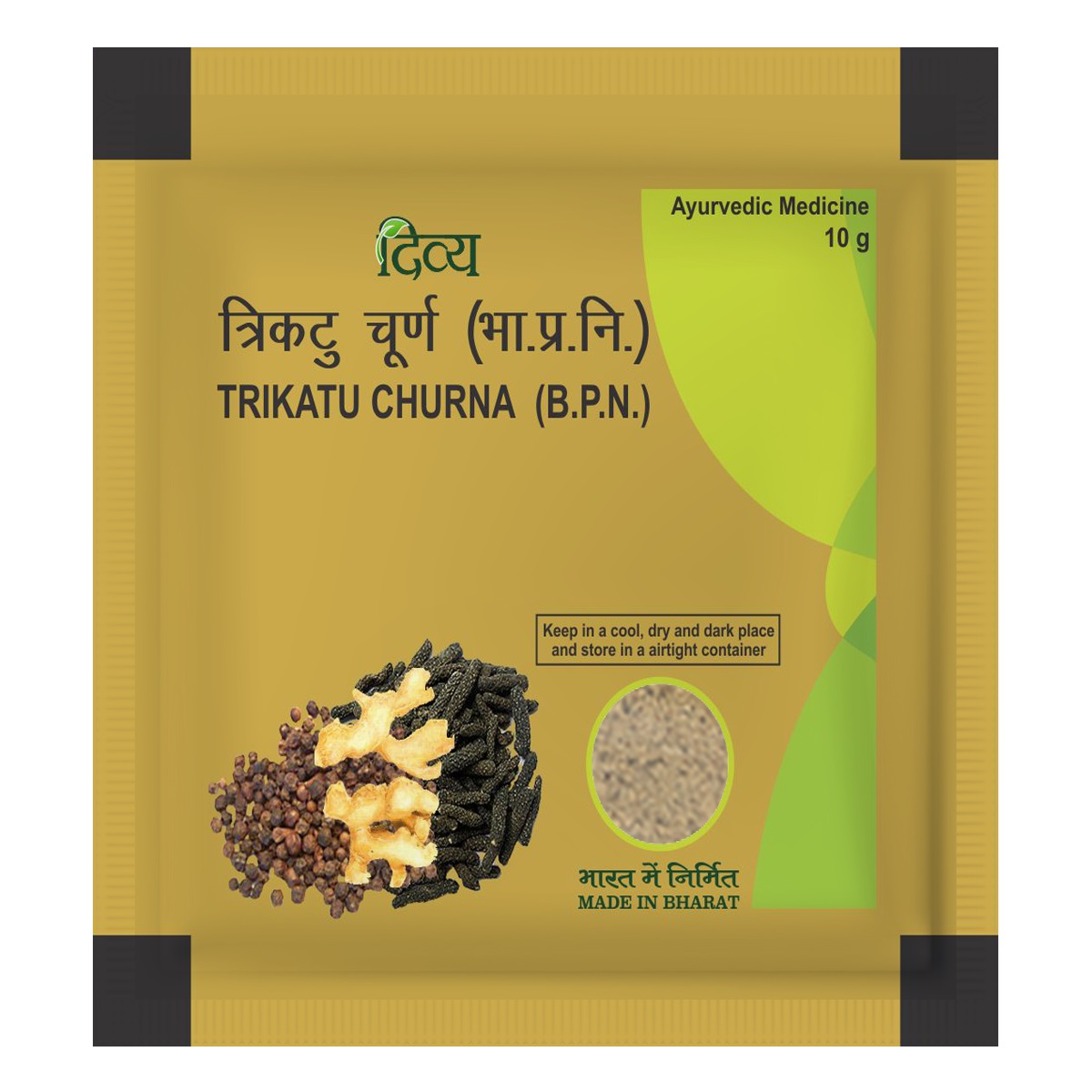 Divya Trikatu Churna is an ayurvedic product useful in indigestion, dyspepsia, cough and other jugular diseases.