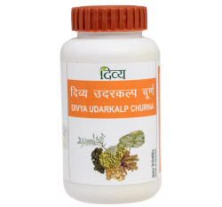 This medicine suppresses biles and is laxative and purgative medicine. Divya udarkalp churna cleans stomach and treats constipation. Its use does not produce any problem or irritation in the intestines. It inflames stomach fire and hence increases digestion capacity. The nature of women, children and old persons is very delicate and hence, strong powders, sold in the market could cause harm to them, but this 'churna' is totally harmless and most effective to them. Different herbs and other materials of ayurveda importance are refined to form powder. Base, salt and acid mixed powder is warm in nature, digestible, tasteful and ignites hunger. Sugar or candy mixed powders are rich in purgation quality, cool and bile suppressive while powders formed of bitter items treat fever and phlegm. The medicines prepared of herbs, which are finely grinned after being dried are called 'churna' in ayurveda.