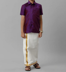 Silk cotton shirt in Violet colour & single layer cream readymade dhoti with gold jari specially made for boys.
