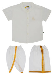 Cotton shirt in cream colour, single layer cream readymade dhoti & panchakacham with elastic waist specially made for newborn babies.