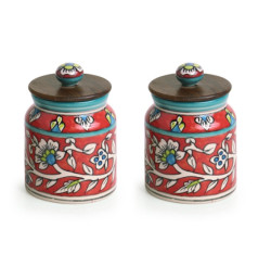 Red and Brown Mughal Cylindrical Multi Purpose Jar with Wooden Lid - Set of 2 :