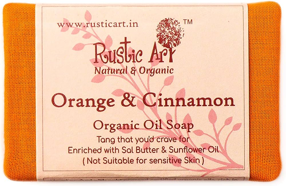 Rustic Art Orange and Cinnamon soap not only prevents, but also kills any bacteria that cause inflammation of the skin. Heals cuts, wounds and burns while leaving behind a lingering fragrance to keep you happy. Turmeric oil is adds on to them to fight off acne. Turmeric is antiseptic controlling the spread of acne or any other skin ailments. Turmeric slows down aging and also helps against the sun damage. Each cold processed soap is handmade using highest quality cold pressed certified organic oils, essential oils and herbs. It's a balanced combination of hard oils like coconut and vegetable butters, and soft oils like sunflower, rice bran, sesame, flax seed, castor and almond which create a soft lather and keep the skin moisturized