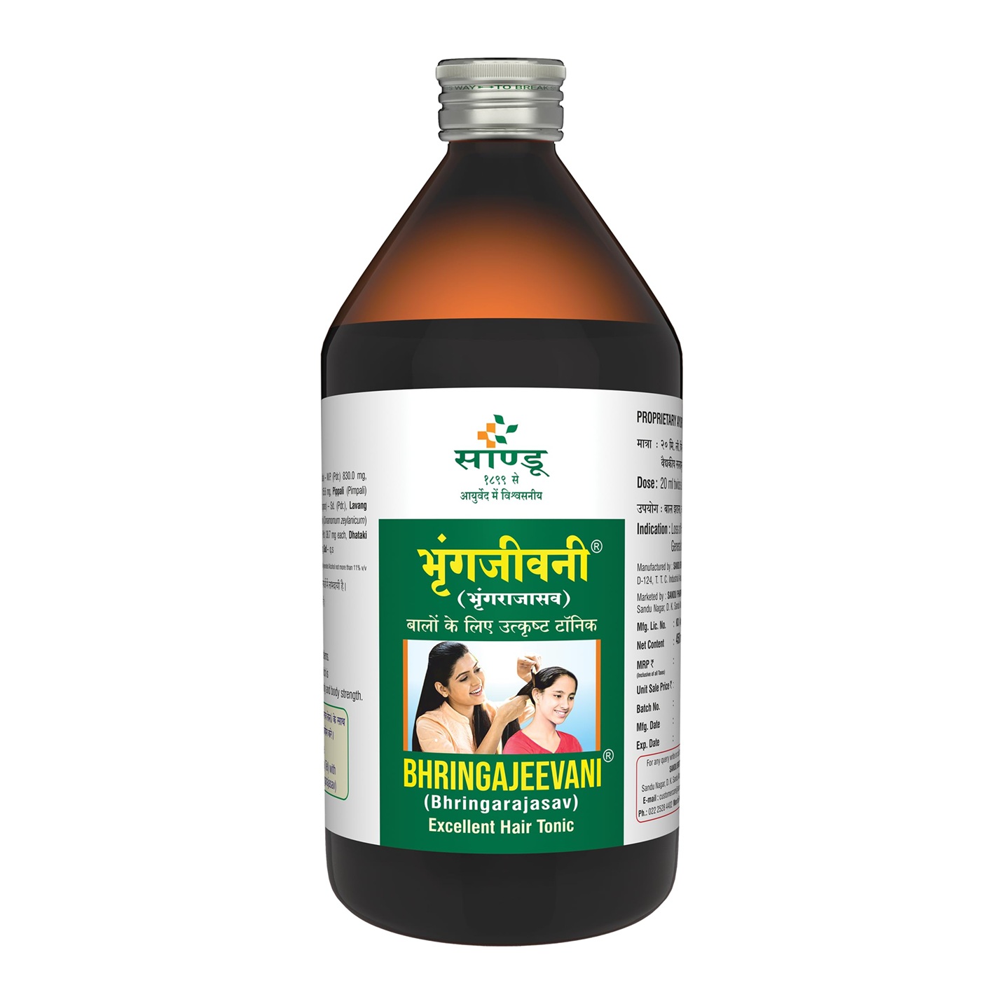 Sandu Bhringajeevani is a proprietary ayurvedic fermented infusion (Asava Kalpana) which acts as a hair growth tonic. Its fermented nature ensures faster absorption into the bloodstream. It acts as an anti-ageing tonic, hence slowing down the process of greying, and controlling hair fall. Due to its Swedajanana (sweat-inducing) property, it promotes hair growth naturally and also promotes the regrowth of new hair. A perfect blend of hair-nourishing and pitta-balancing herbs which help repair damaged hair and nurture the scalp. Additionally, its cardiotonic and anti-stress properties help improve blood circulation. All these factors make Bhringajeevani an excellent ayurvedic hair loss treatment.