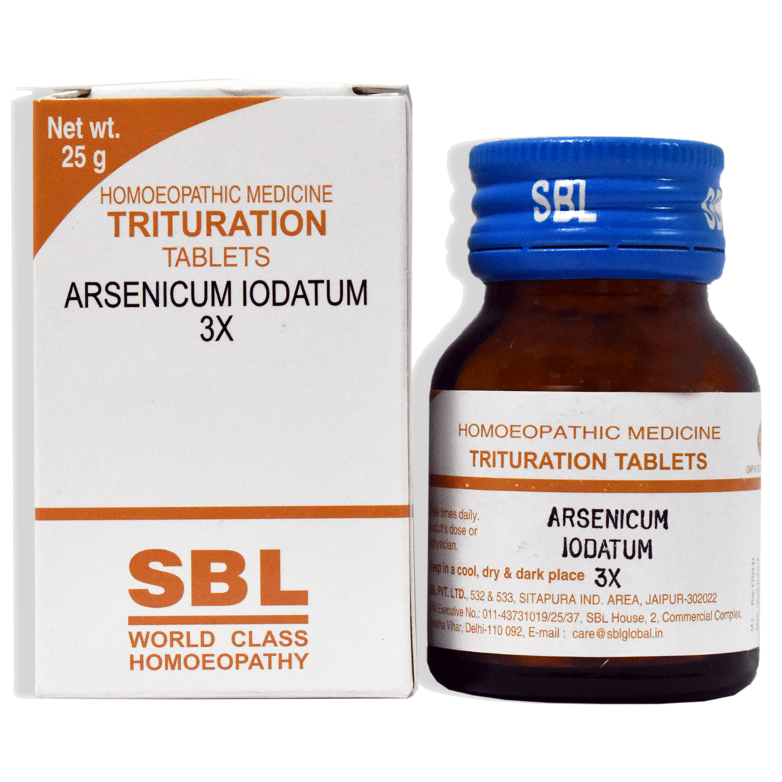 SBL's Arsenicum Iodatum Trituration Tablet is a homoeopathic medicine carefully crafted from authentic raw materials, rendering it highly effective in addressing various health issues. It proves beneficial in combating viral infections and alleviating swollen tonsils. This remedy is instrumental in the treatment of common ailments like cold, cough, and fever.