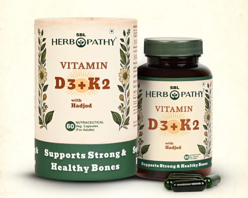 SBL Herbopathy Vitamin D3 K2 with HadjodTraditional support for bone & joint health. Turmeric + Black Pepper