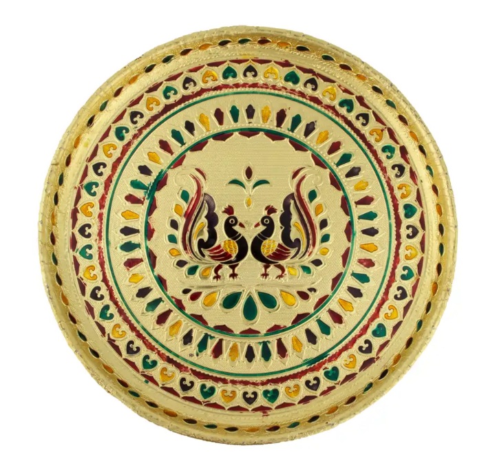 The Minakari design tray is a round-shaped tray that is commonly used for pujas, religious ceremonies, or as a decorative piece in homes.