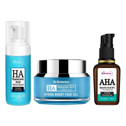 Get ready for the radiant skin you've always wanted with St.Botanica's Blemish-free Glow Kit! This easy 3-step routine includes a hydrating Hyaluronic Acid Face Wash, an exfoliating AHA Glycolic Acid 8% Skin Peel, and a nourishing Hyaluronic Acid Face Gel. The powerful combination of these products helps improve your skin's texture and pigmentation, leaving you with an even tone and smooth skin. The hydrating ingredients in the kit help plump and soften your skin, giving you a gorgeous, glass-like finish that's sure to turn heads.