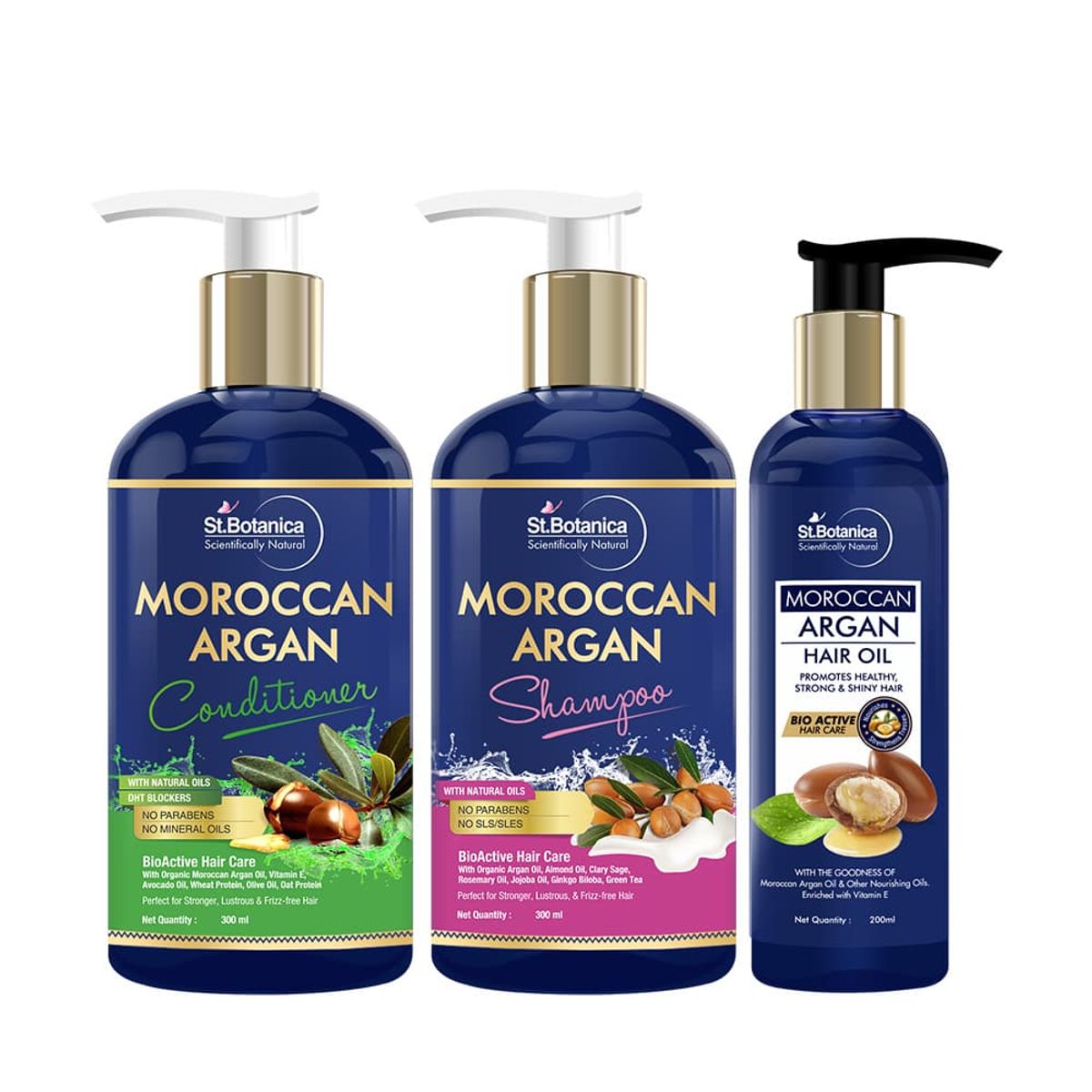 This hair oil, shampoo and conditioner combo is enriched with the goodness of plant extracts and natural oils like Moroccan Argan Oil, Almond Oil, Olive Oil, Coconut Oil and Jojoba Oil.
