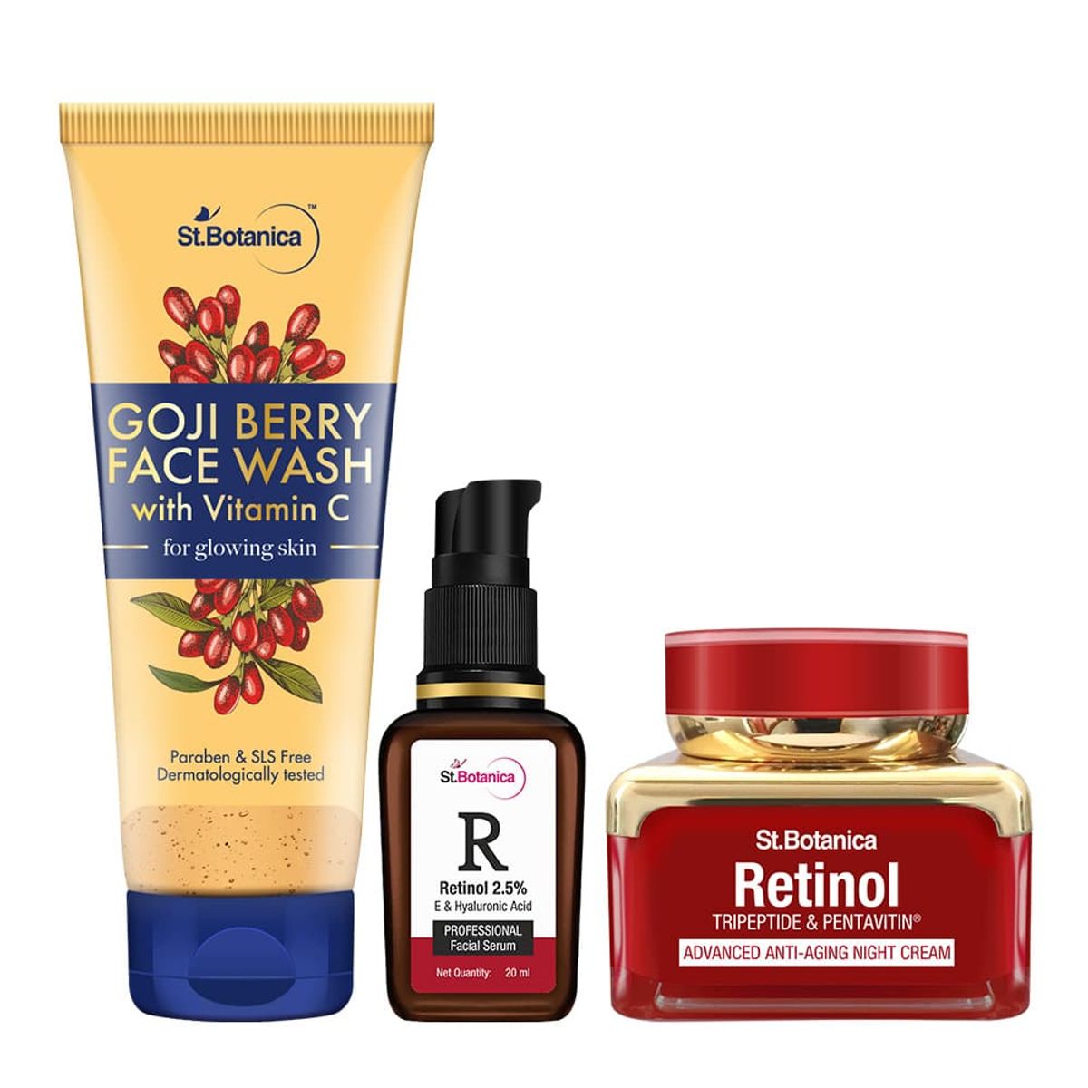 A Radiance Renewal Kit that targets signs of premature ageing and skin dullness. This kit contains Goji Berry Face Wash, Retinol 2.5% Serum & Retinol Night Cream