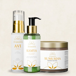Svarasya’s ‘Tarunya - Advanced Oily Skin Ritual for Anti-Aging and Blemish-Free Skin’ ritual is designed to control excess oil, prevent breakouts, and reduce the signs of aging. The ritual combines the purifying power of Kamya, the clarifying benefits of Sumukha, and the protective features of Avi to offer a comprehensive skincare solution for oily and acne-prone skin.