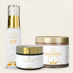 Svarasya’s ‘Avrutti - Ultimate Sun Protection Ritual for Anti-Aging Skin’ ritual is designed to purify, hydrate, and protect your skin from the sun while combating the signs of aging. The ritual combines the purifying power of Kiyomeru, the repairing benefits of Shata Dhauta Ghrita, and the protective features of Avi to offer a comprehensive skincare solution for sun protection and anti-aging.